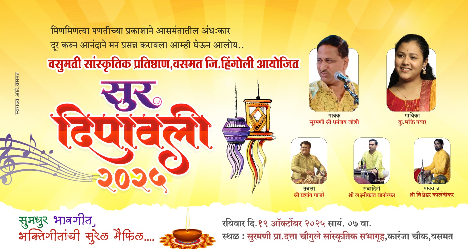 वसमत येथे दिपावली निमित्त प्रथमच वसूमती सांस्कृतिक प्रतिष्ठान वसमत यांच्या वतीने या वर्षी ‘सुर दिपावली 2025’ अंतर्गत भावगीत व भक्तीगीतानी सजलेल्या सुरेल व सुंदर मैफिलीचे आयोजन सुरमणी प्रा दत्ता चौगूले सांस्कृतिक सभागृहात रविवारी ता.१९ सायंकाळी ७ वाजता करण्यात आले आहे.