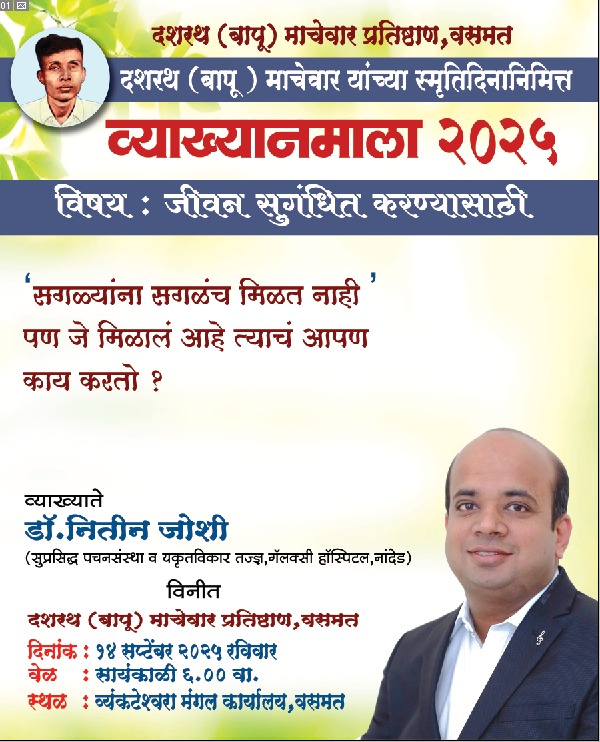 वसमत येथील सामाजिक कार्यकर्ते कै. दशरथ उर्फ बापू माचेवार यांच्या शैक्षणिक व सामाजिक कार्याचा वसा पुढे नेण्यासाठी स्थापन करण्यात आलेल्या दशरथ (बापू) माचेवार प्रतिष्ठानच्या वतीने प्रतीवर्षी १४ सप्टेंबर रोजी एक व्याख्यानमाला आयोजित केली जाते. व्याख्यान मालेचे हे दुसरे वर्ष असून त्यात यावर्षी नांदेड येथील एंडोस्कोपी तज्ञ डॉ. नितीन जोशी यांचे व्याख्यान होणार आहे.